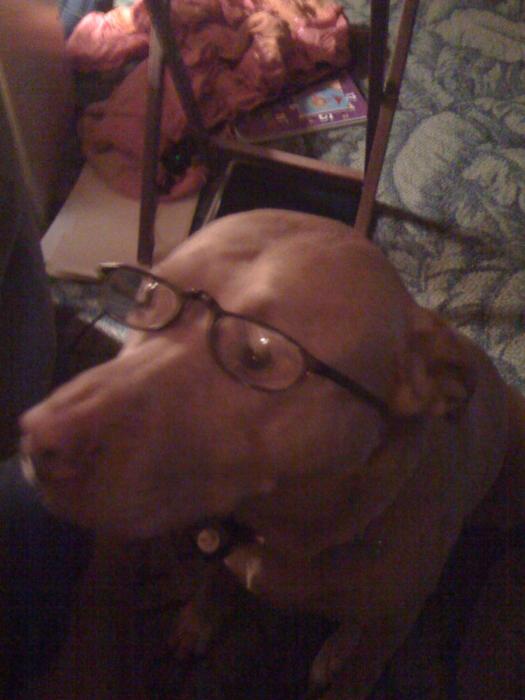 0 OMG how cute! She sat for that? I keep trying to put stuff on my dogs but they just won't sit still for glasses.